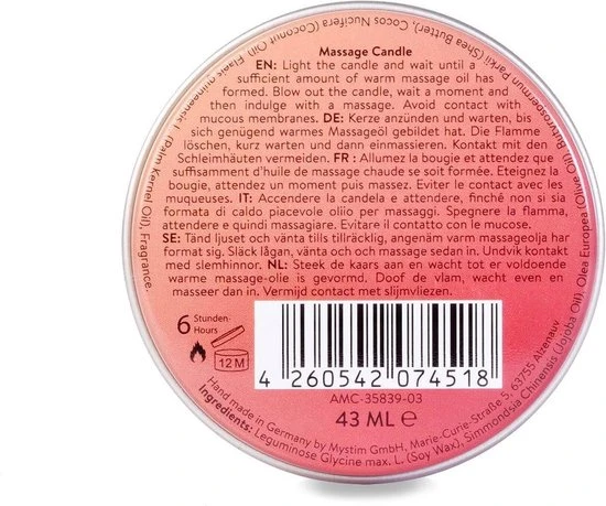 Geef jezelf over aan je partner en laat je verwennen door de delicate, verzorgende olie van de AMORELIE Care massagekaars. De kaars verspreidt een sensuele geur – perfect leuke momenten samen. Steek de kaars aan en wacht een paar minuten tot er voldoende olie vloeibaar is geworden. Blaas de kaars gewoon weer uit, laat hem even afkoelen en giet de vloeibare olie in je handen om elkaar, eventueel om de beurt, te verwennen. De olie werkt als een verzachtende balsem op de huid, voedt en hydrateert.