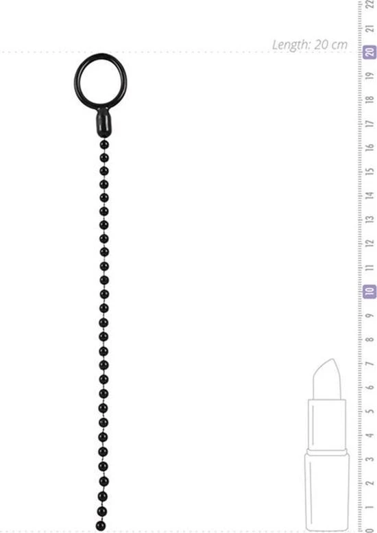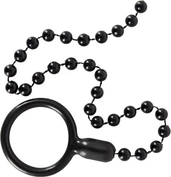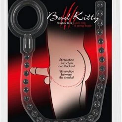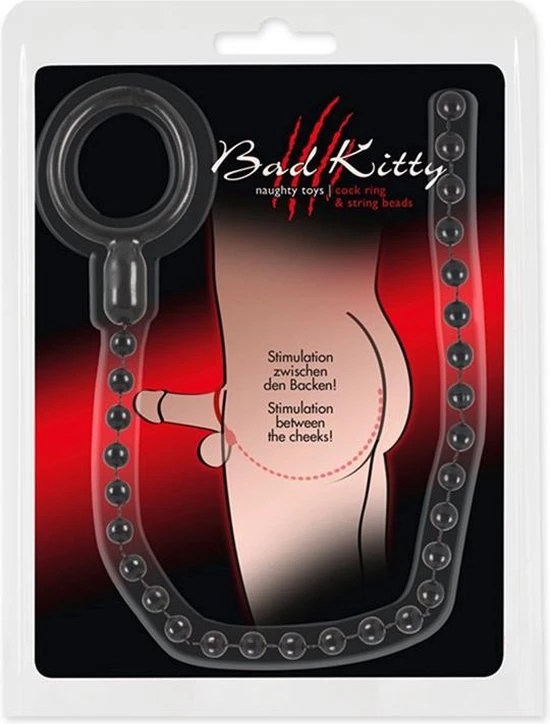 Deze zwarte cockring van Bad Kitty is voorzien van een anaal ketting. De ketting wordt niet ingebracht, maar tussen de billen door gedragen. Hierdoor ervaart de drager stimulatie op zijn perineum en tussen zijn billen zonder dat hij anaal iets hoeft in te brengen. De cockring is zacht en rekbaar waardoor hij voor veel maten geschikt is. De ketting is flexibel voor een perfecte pasvorm.