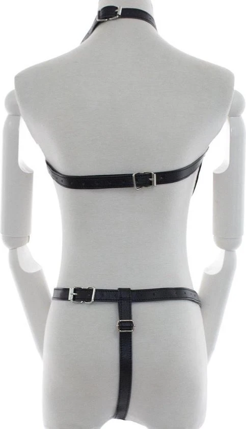 De gebruikte zilverkleurige ringen en studs maken de hele look af. Had je partner plannen voor de avond, als je hierin gezien wordt dan zullen de plannen zeker veranderen. Door de eenvoudig te verstellen riemen past deze outfit bijna iedereen.