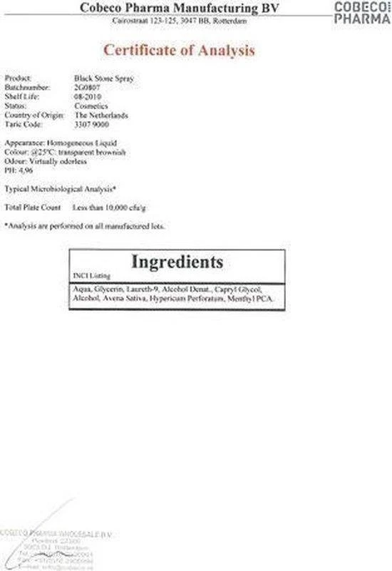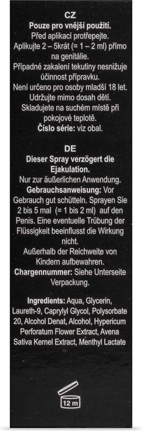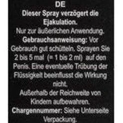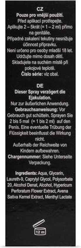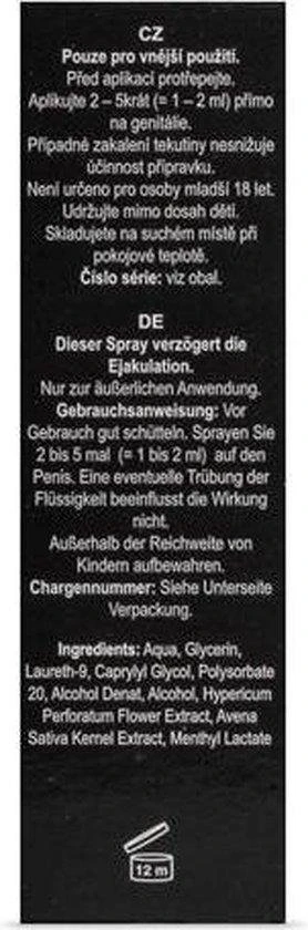 Een heerlijke lange vrijpartij is waar veel koppels van dromen, maar vaak komt de climax toch te vroeg. Met de Blackstone Delay Spray verleng je het seksueel plezier, zodat je opbouwt naar een intens en diepgaand orgasme. Dit sekshulpje komt in een handige flacon voor uiterst precies gebruik. Spray simpelweg op de penis en ervaar de wonderen van deze Blackstone Delay Spray. Je kiest daarbij zelf of je de volledige penis bedekt, of alleen de eikel wat bevochtigt. Wat je ook verkiest, je wordt alleszins voor enige tijd minder gevoelig, zodat jij en je partner extra lang van elkaar genieten. Het gevoel keert nadien vanzelf terug in je penis. De 100% natuurlijke ingredi?nten garanderen bovendien dat deze vloeistof veilig is voor de meest intieme zones van jezelf en je partner.
