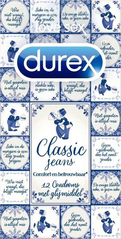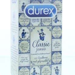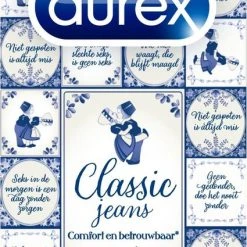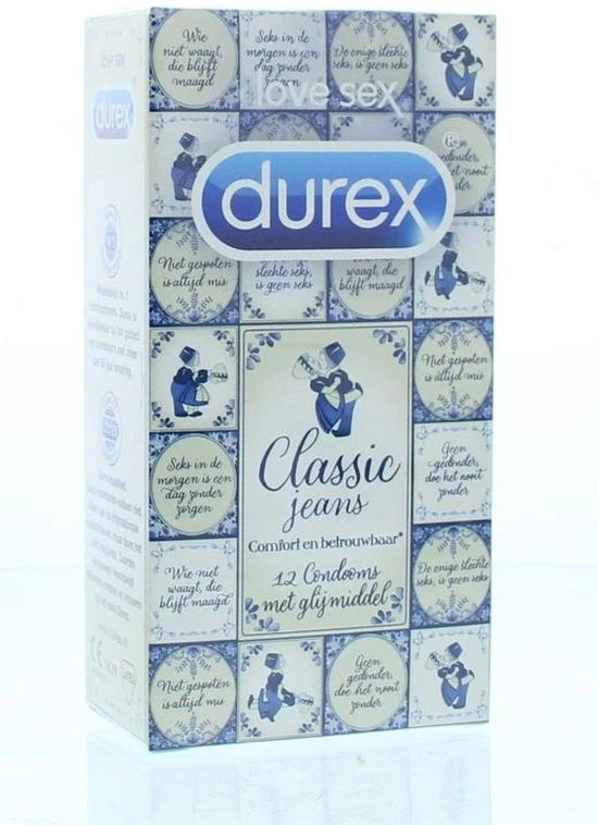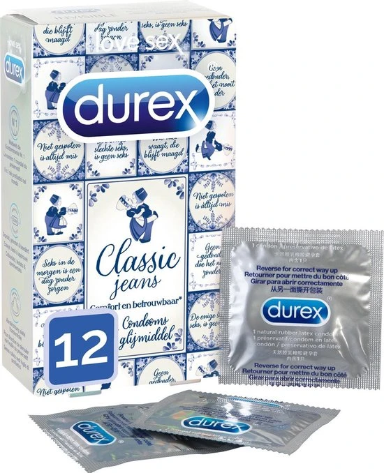 De Durex condooms Classic Jeans zijn condooms met extra glijmiddel voor nog meer sensatie. Durex blaast 90 kaarsjes en viert daarom de Nederlandse cultuur met een verpakking met de Delfts Blauwe kleuren. De condooms zijn 100 % elektronisch en dermatologisch getest, en voldoen aan dezelfde kwaliteitseisen als de latex condooms van natuurlijk rubber. Ze hebben een speciale pasvorm voor meer comfort. Voor nog meer sensatie en comfort kun je deze condooms gebruiken met een Durex glijmiddel. Verpakking van 12 condooms.VEILIGHEIDSVOORSCHRIFTEN: Lees de gebruiksaanwijzing aan de binnenkant van de verpakking aandachtig door, vooral bij gebruik van het condoom voor anale of orale seks. Geen enkel voorbehoedsmiddel biedt u een 100%betrouwbare bescherming tegen zwangerschap, hiv (aids) of andere seksueel overdraagbare aandoeningen. Condooms kunnen verstikkingsgevaar opleveren. Buiten bereik van kinderen bewaren.