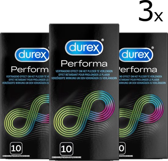 De Durex Performa Condooms zijn ontworpen voor langdurig genot. Het orgasme wordt uitgesteld door een speciale gel aan de binnenkant van het condoom. Het condoom is voorzien van een Easy-On pasvorm. Het reservoir zorgt voor meer genot en comfort, omdat het speciaal ontwikkeld is. Dit is een grootverpakking en bevat 3x dit product.