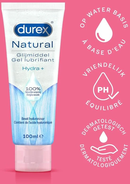 Durex Naturals Moisture-glijmiddel is gemaakt van 100% natuurlijke ingrediΓ«nten en werd ontwikkeld om seks nog aangenamer te maken. Het hydrateert en houdt vocht vast dankzij natuurlijk hyaluronzuur, het natuurlijke, krachtige ingrediΓ«nt van de huidverzorging. Werkt ook prima als massagegel.