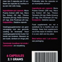 Muira Puama Extract 200mg, Macra Dry Extract 50mg, Zink Monomethione 18% 41mg (50% ADH), Tribulus Terrestris 30mg, Radix Ginseng 21mg, overige ingredi?nten: Gelatine capsule.