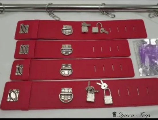 Roest vrije stalen stang met 4 haken met handboeien en boeien voor de enkels met 4 SLOTJES.