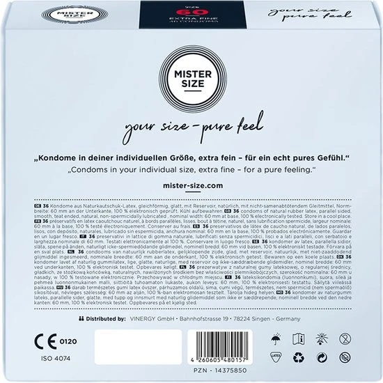 De condooms van het Duitse merk Mister Size worden gemaakt in diverse maten, zodat je altijd een perfect passend condoom kunt vinden.