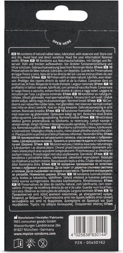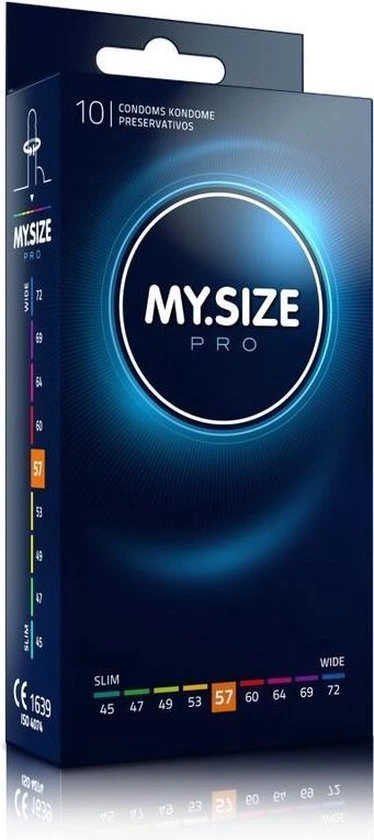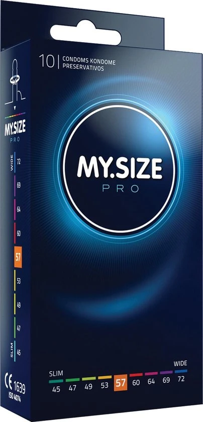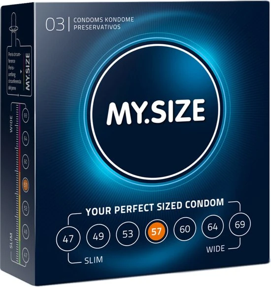 De condooms van het Duitse merk MySize worden gemaakt in diverse maten zodat er altijd een perfect passend condoom beschikbaar is. Het dragen van een goed passend condoom draagt niet alleen veel prettiger, maar verhoogt ook de veiligheid tijdens het gebruik. Deze condooms met een breedtemaat van 57 mm zijn strakkere condooms met de volgende afmetingen: