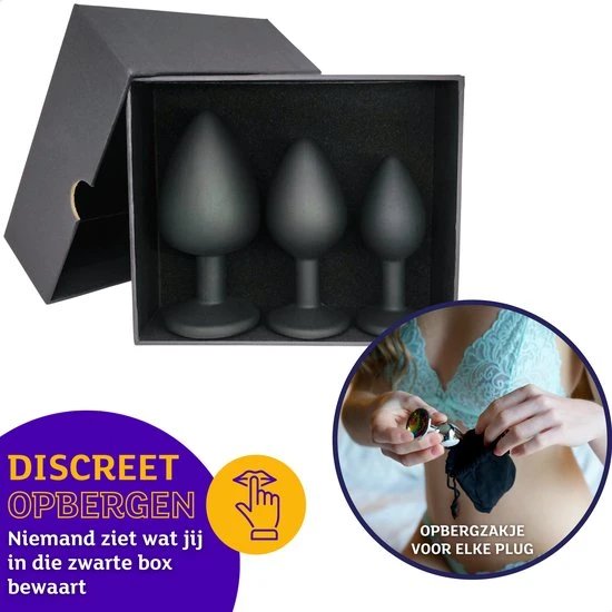 De buttplug set komt met een luxe zwarte giftbox en fluwelen opbergzakjes waar je de buttplugs na gebruik weer discreet in kunt opbergen. Hierdoor blijven de plugs netjes is de set ook perfect als geschenk voor jezelf of je partner.