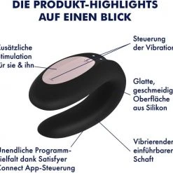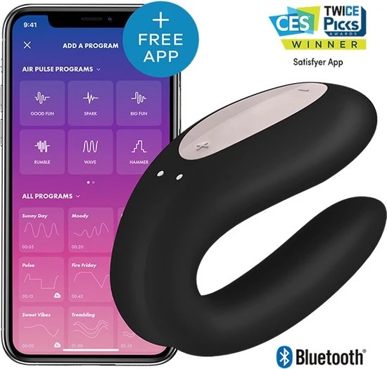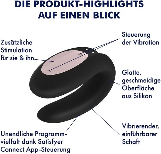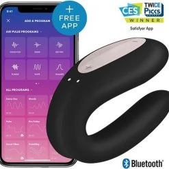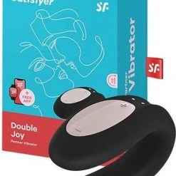De Satisfyer Double Joy Koppel Vibrator is een elegant vormgegeven vibrator die speciaal ontworpen is voor gebruik door koppels. De vibrator wordt door de vrouw gedragen en zorgt voor extra stimulatie voor beide partners. Het smalle gedeelte wordt in de vagina ingebracht, zodat het vibrerende, brede gedeelte op de clitoris rust. Doordat het ingebrachte gedeelte smal en plat is, blijft penetratie mogelijk. Op deze manier voelt de man tijdens het penetreren de vibraties van de Double Joy. Ook zorgt het smalle uiteinde voor G-spot stimulatie en wordt de vagina nauwer, waardoor de man nog meer stimulatie zal ervaren. Er zijn op deze toy standaard diverse vibratiestanden en patronen beschikbaar. Maar deze toy is ook te koppelen aan de gratis Satisfyer App zodat jullie naar eigen wens eigen standen en patronen kunnen cre?ren. Boven de bedieningsknop zit het oplaadpunt, die te herkennen is aan de twee zilverkleurige stipjes. Dit zijn magneetjes waar je de USB-oplaadkabel aan kunt bevestigen. De kabel kun je op deze manier heel eenvoudig op de vibrator klikken. Plug de kabel in in een elektronisch apparaat met USB-aansluiting en jouw speeltje is na 2 uur weer volledig opgeladen. Gebruik voor de Double Joy Koppel Vibrator altijd een glijmiddel op waterbasis. Een siliconen glijmiddel tast het siliconen materiaal van het speeltje aan, waardoor bacteri?n zich kunnen nestelen en hij niet meer hygi?nisch te gebruiken is.