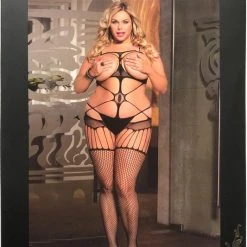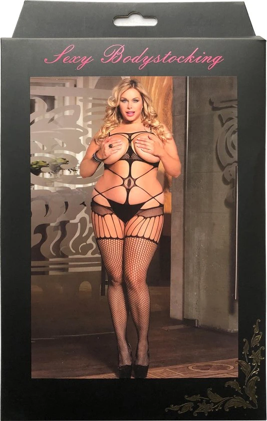 Uitdagende zwarte catsuit met open kruis en jarretel look. Door de open cups kan je partner overal goed bij en het open kruis zorgt ervoor dat je de catsuit niet uit hoeft te trekken tijdens jullie heetste momenten.