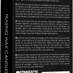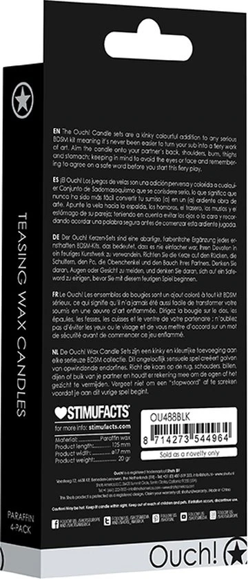 De Ouch! Wax Candle Sets zijn een kinky en kleurrijke toevoeging aan elke serieuze BDSM collectie. Dit ongelooflijk sensuele spel cre?ert golven van opwindende endorfines. Richt de kaars op de rug, schouders, billen, dijen of buik van je partner en houdt er rekening mee om de ogen of het gezicht te vermijden. Vergeet niet om een ?stopwoord” af te spreken voordat je aan dit vurige spel begint