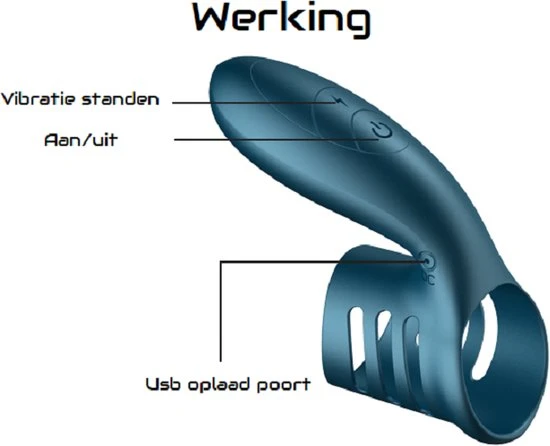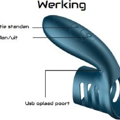 Houdt de knop aan de onderkant drie seconden in om de penisring aan- of uit te zetten. Bij kort indrukken van die zelfde knop kun je de verschillende tril vibraties instellen.