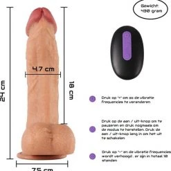 Het formaat van deze trillende dildo is 24 x 4.7 cm. De penis zelf heeft een inbreng lengte van 18 cm met een dikte van 4,7 cm. De Dildo is zo buigzaam dat verschillende standen ervoor zorgt dat er voor elke type vrouw wat lekkers tussen zit. Ook is de kwaliteit uitmuntend te noemen, luxe uitstraling, betrouwbare TPR-materialen (beter dan gewone siliconen).