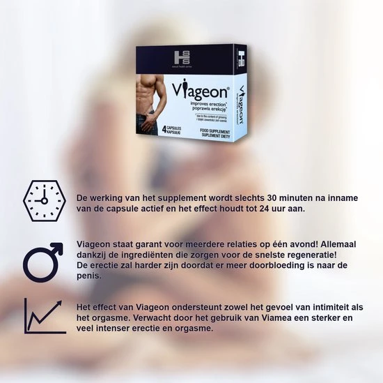 De werking van het supplement wordt slechts 30 minuten na inname van de capsule actief en het effect houdt tot 24 uur aan. Om een ??sterke erectie te krijgen, heb je seksuele stimulatie nodig, dus je hoeft je 24 uur lang geen zorgen te maken over een aanhoudende vermoeiende erectie. Viageon staat garant voor meerdere relaties op ??n avond! Allemaal dankzij de ingredi?nten die zorgen voor de snelste regeneratie!