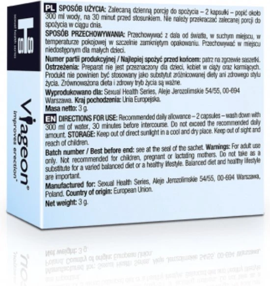 Houd er rekening mee dat het Viageon-supplement alleen bedoeld is voor volwassenen. Daarom moet het buiten het bereik van kinderen worden bewaard, droog en koel. Lees voor gebruik de ingredi?nten – als u allergisch bent voor een ingredi?nt, neem het product dan niet in.