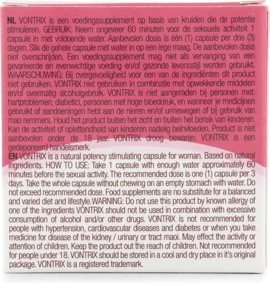 Het innemen van een capsule Vontrix Pink is heel eenvoudig. U slikt de capsule met een glas water, minimaal een uur voordat u seks wilt hebben. De effecten worden merkbaar na gemiddeld een uur. Soms gebeurt dit sneller, soms duurt het wat langer. Dit verschilt per persoon. Neem in ieder geval nooit meer dan 1 capsule per 24 uur in. Hoewel bijwerkingen slechts zelden voorkomen kan het gebeuren dat u ongewenste effecten ervaart. Als dit het geval is, staak dan direct het gebruik van Voltrix Pink. Raadpleeg bij ernstige verschijnselen altijd uw huisarts.