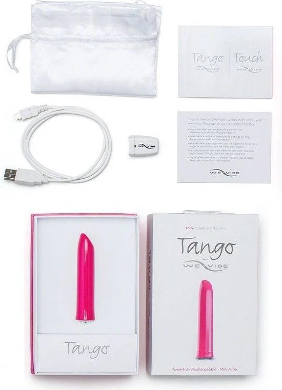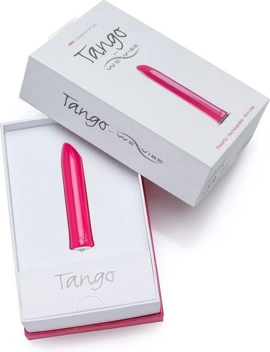 De introductie van de nieuwe Tango by We-Vibe! De meest krachtige mini-vibe.Klein maar krachtig, levert Tango diepe, rumbling vibraties precies waar je ze wilt hebben.Neem krachtig genot overal mee naartoeKlein, krachtig en zakformaat. Tango is ontworpen voor nauwkeurige externe stimulatie. De taps toelopende top levert intense vibraties met uiterste focus, terwijl de vlakke rand perfect voor is voor een all-over massage. Het is oplaadbaar, lichaamsveilig en 100% waterdicht. Met 8 vibratiestanden om uit te kiezen, is Tango perfect op zijn eigen of om vibraties aan jouw favoriete speeltjes toe te voegen.De meest krachtige oplaadbare mini-vibe- Twee uur spelen met een enkele lading. Low-power waarschuwing vertelt je wanneer weer op te laden.100% waterdicht- Gebruik het in de douche of bad. Eenvoudig te reinigen met water en zeep.Lichaamsveilige PC ABS thermoplastisch- Vrij van ftalaten, latex en BPA.Samenvatting kenmerken- Krachtige, stille vibraties- 100% waterdicht- 90 minuten opladen- 8 vibratiestanden- Low-power waarschuwing- Controle van genot met 1-knop- Lichaamsveilig – PC ABS thermoplastisch – vrij van ftalaten, latex en de BPA- Milieuvriendelijk – carbon-neutraal, oplaadbare batterij en recyclebare verpakking- Tot 2 uur spelen op een enkele lading- 1 jaar garantie- Eenvoudig schoonmaken met zeep en water- Gebruik alleen met glijmiddel op waterbasis- Alleen voor uitwendig gebruikWat is inbegrepen- Tango by We-Vibe vibrator: de meest krachtige mini-vibe- USB-kabel en oplaadcap: met de standaard USB-kabel kan je opladen via een USB-poort of met een USB AC-adapter (niet meegeleverd, overal verkrijgbaar)- Opbergzak: zijdeachtig tasje voor eenvoudig opbergen en om mee te reizen- Handleiding en productregistratiekaart: gellustreerde, meertalige handleiding – Engels, Chinees/Mandarijn, Tsjechisch, Nederlands, Frans, Duits, Japans, Pools, Portugees, Russisch, Spaans en Zweeds