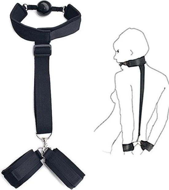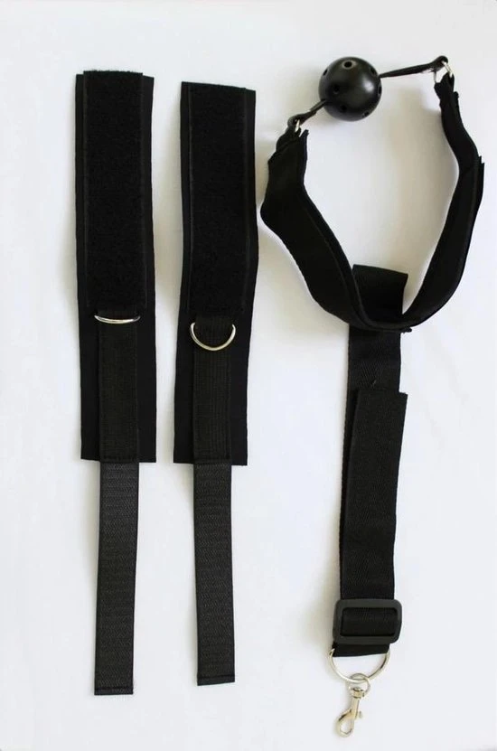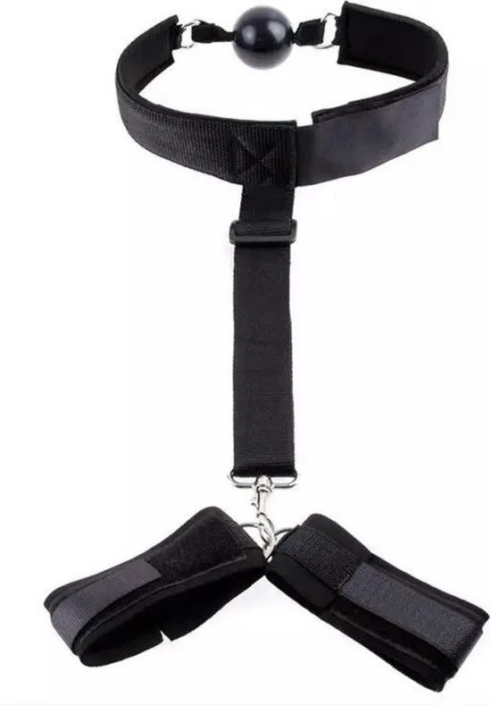 Mooi uitgevoerde boeien-set, bestaande uit een gag-ball en twee handboeien die aan elkaar vast zitten.