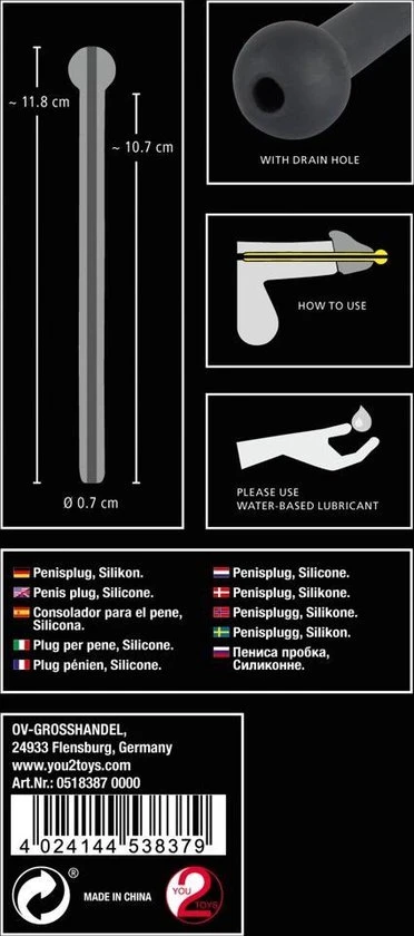 Introduceer dit speeltje in jouw collectie wanneer je wilt experimenteren met de natte spelletjes. Door de het tunnel ontwerp is ejaculeren evenals urineren vanuit de plug mogelijk. Laat de warme vloeistoffen jouw lichaam verlaten door de deze penis plug naar de eindbestemming. Tevens ook solo te gebruiken en jezelf te verwennen. Flexibel. 11.8 cm lang, inbrengdiepte 10.7 cm. diameter 0,7 cm. Siliconen, ftalaat-vrij volgens EU-richtlijn 1907/2006 / EG.