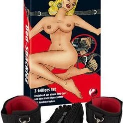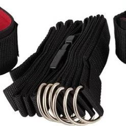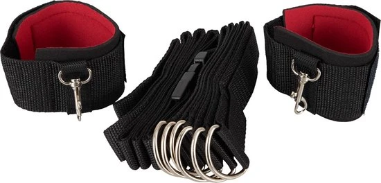 band van 5 meter. Deze is voorzien van meerdere metalen ogen waar de 2 handboeien aan vast gemaakt kunnen worden d.m.v. karabijnhaken. De boeien zijn eenvoudig te sluiten met klittenband.